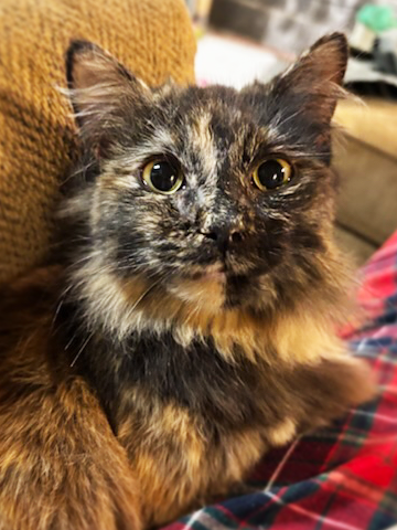 Divinity Fluff is every bit as sweet as her name implies. As a tortie, she seems to be somewhat lacking in the tortitude department since she is most agreeable and not much of a backtalker. She is considering a career path in what else but the divinities! Whether that is spiritual study or confectionary practices, we frankly aren't sure as she has been a bit vague.